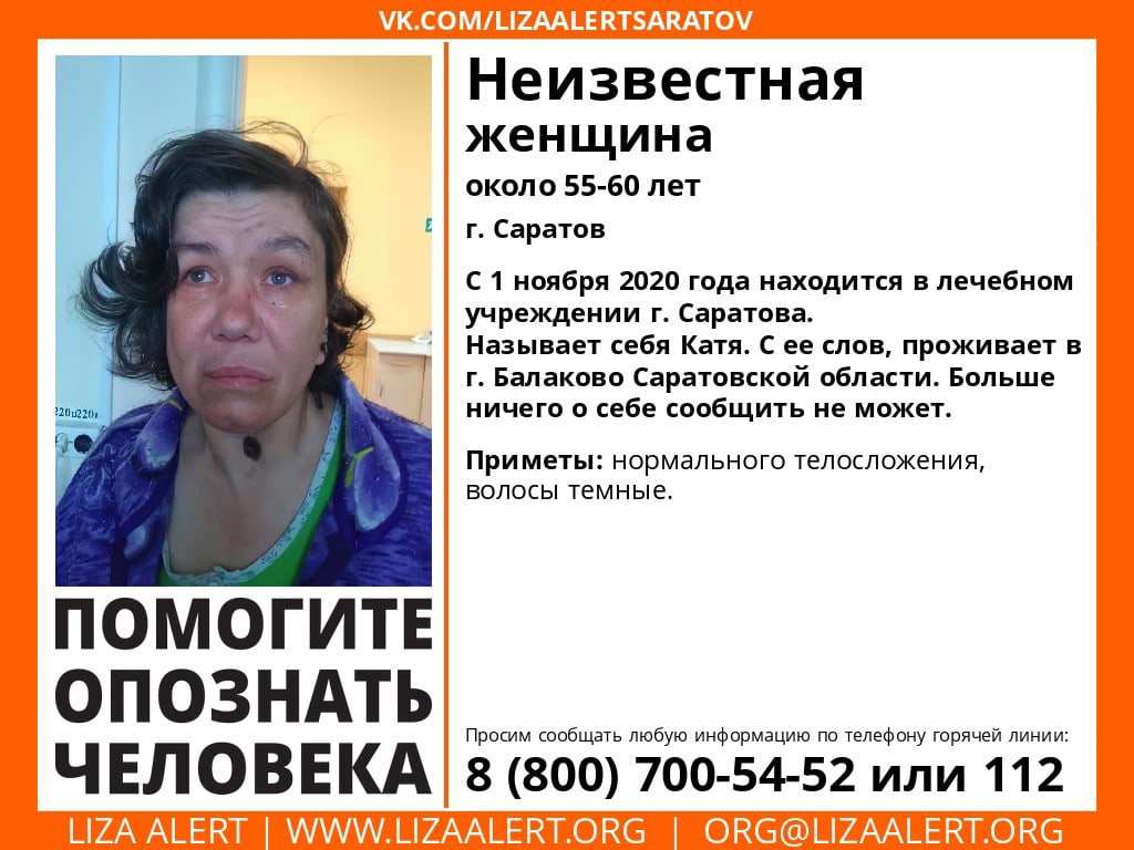 Неизвестная женщина, около 55-60 лет С 1 ноября 2020 года находится в лечебном учреждении г. Саратова. Называет себя Катя. С ее слов, проживает в г. Балаково Саратовской области. Больше ничего о себе сообщить не может. ПРИМЕТЫ: нормального телосложения, волосы темные. Инфорг Людмила Соловушка, 89372240660 Тема на форуме https://vk.cc/aC3VjW